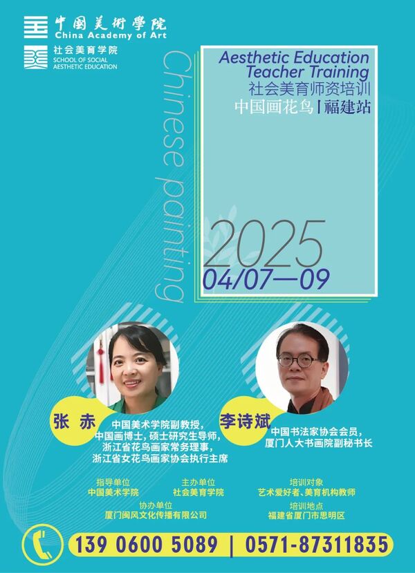 “中国美术学院社会美育师资培训班”(中国画花鸟专业 ),由中国美术学院作为指导单位,中国美术学院社会美育学院主办,同时邀请国内知名画家,通过与专家导师们的零距离学习、系统专业化训练,创新教学模式,培养中国画花鸟创作专门人才,将高校教育资源与社会人才培养相对接。