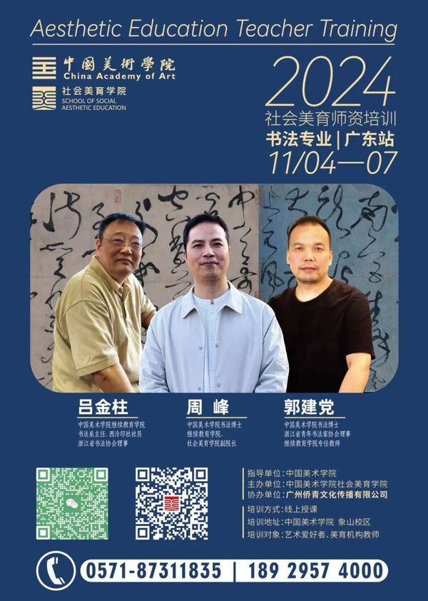 “中国美术学院社会美育师资培训班”(书法专业),由中国美术学院作为指导单位,中国美术学院社会美育学院主办,同时邀请国内知名画家,通过与专家导师们的零距离学习、系统专业化训练,创新教学模式,培养书法创作专门人才,将高校教育资源与社会人才培养相对接。