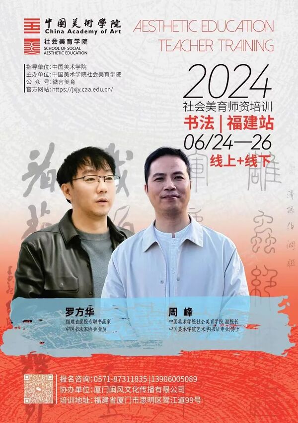 “中国美术学院社会美育师资培训班”(书法专业),由中国美术学院作为指导单位,中国美术学院社会美育学院主办,同时邀请国内知名书法家,通过与专家导师们的零距离学习、系统专业化训练,创新教学模式,培养书法创作专门人才,将高校教育资源与社会人才培养相对接。