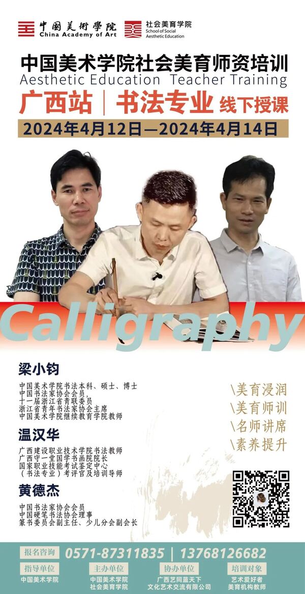 为落实中共中央办公厅、国务院办公厅印发的《关于全面加强和改进新时代学校美育工作的意见》精神,全面加强和改进新时代学校美育工作,提升国内边远民族地区美术教师和社会美术教育从业人员师资执教能力,特开设“中国美术学院社会美育师资培训班”(书法专业)欢迎全国各省份、直辖市学员踊跃报名。