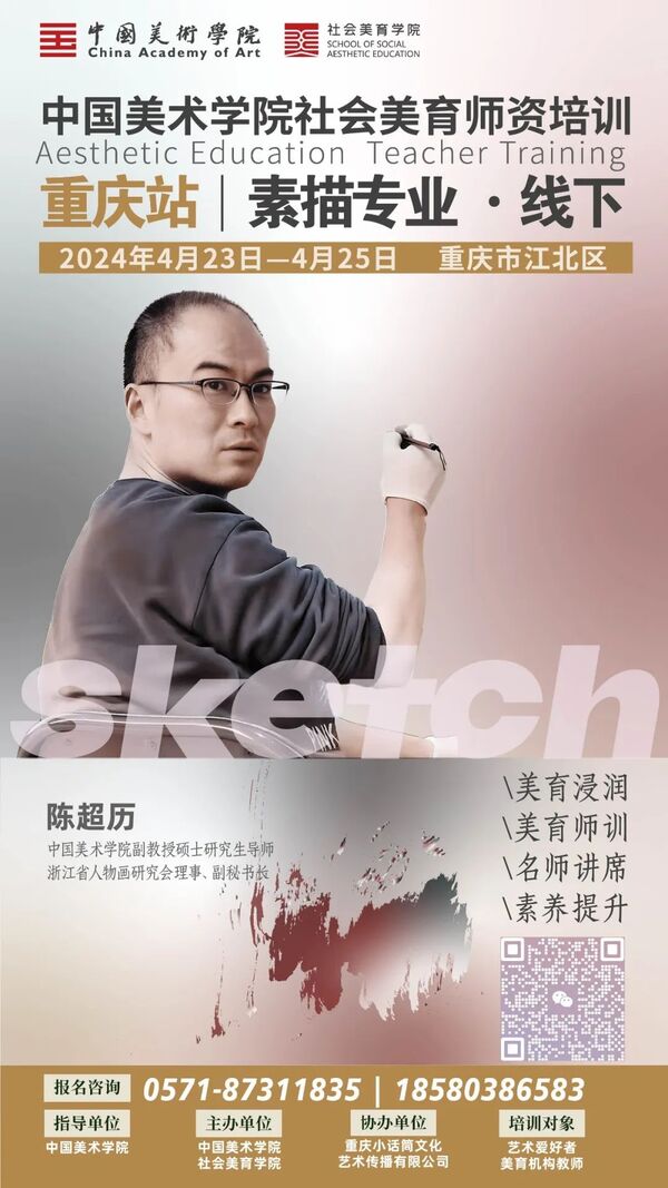 “中国美术学院社会美育师资培训班”(素描专业),由中国美术学院作为指导单位,中国美术学院社会美育学院主办,同时邀请国内知名书法家,通过与专家导师们的零距离学习、系统专业化训练,创新教学模式,培养书法创作专门人才,将高校教育资源与社会人才培养相对接。
