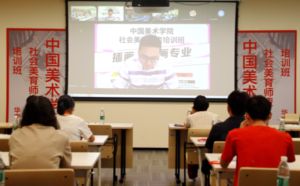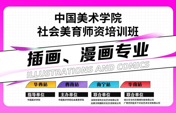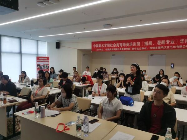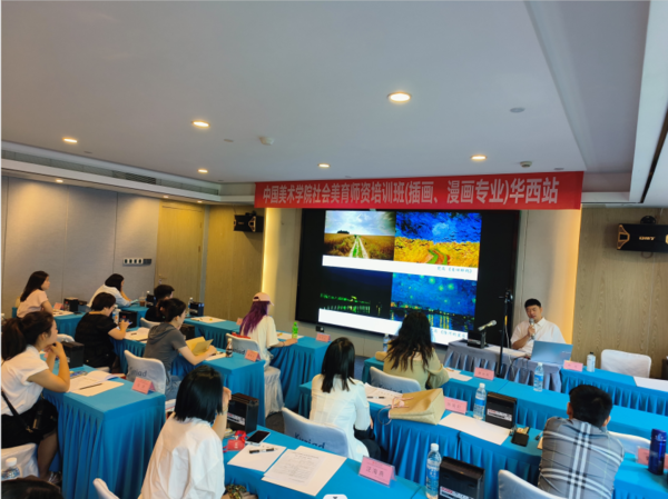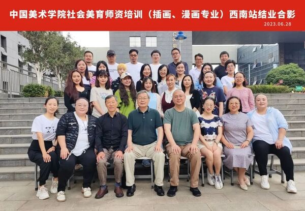 2023年6月26日,“中国美术学院社会美育师资培训班(插画、漫画专业)”通过线上和线下相结合的方式在成都、昆明、南宁、深圳拉开序幕。开班仪式由社会美术水平考级中心办公室主任王音青老师主持,出席开班仪式的领导和嘉宾有中国美术学院社会美育学院院长竺照轩副教授、 动画与游戏学院阮筠庭副教授、陈敏副教授、叶露盈老师、金幸佳老师、四川省美术家协会连环画漫画艺术委员会主任斯政老师、广西艺术学院美术学院装帧插图专任教师王珏老师、日本知日动漫留学塾教师赵帮妮老师以及各分会场负责人,来自全国不同地区的109名一线美育教师参加本次培训。