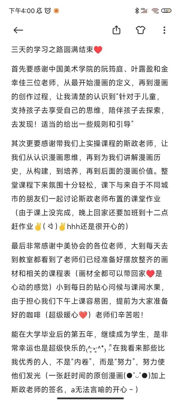 在结营仪式上,各位学员纷纷表示,此次美育教育研学之旅让他们深有所悟,不仅在专业教学技能上受益匪浅,更是让他们重燃了创作的激情,在今后的工作中,他们将继续发挥所学知识和技巧,积极践行美育教育,以美育之心育美,让学生受到美的教育和爱的熏陶,不断引导孩子们发现美、感受美、创造美。