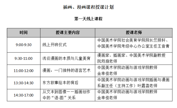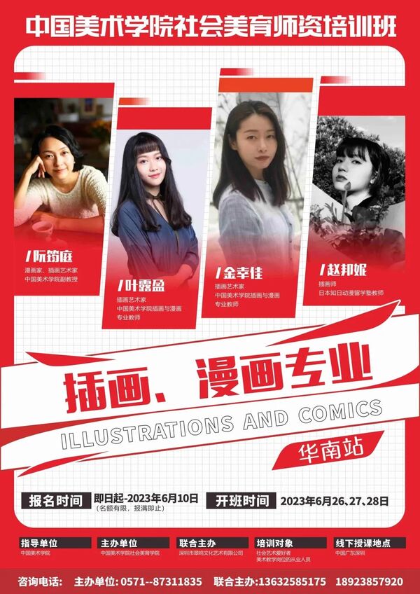 本届特举办中国美术学院社会美育师资培训班——插画、漫画专业,由中国美术学院作为指导单位,中国美术学院社会美育学院主办。同时邀请漫画家、插画家、中国美术学院阮筠庭副教授,中国美术学院动画与游戏学院插画与漫画系副主任(主持工作)叶露盈老师,中国美术学院动画与游戏学院教师金幸佳老师,插画师、日本知日动漫留学塾教师赵邦妮老师作为本期培训导师,将高校教育资源与社会人才培养相对接。