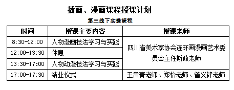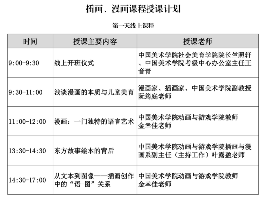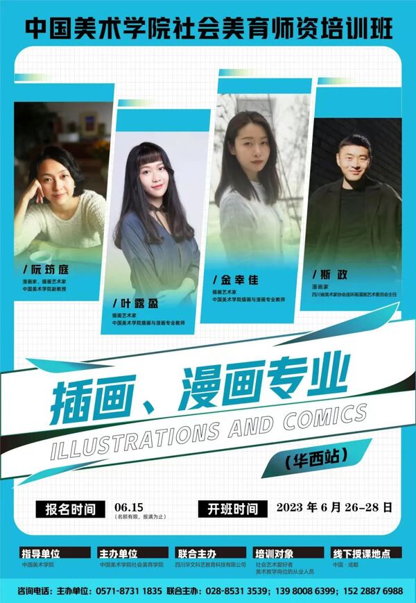 本届特举办中国美术学院社会美育师资培训班——插画、漫画专业,由中国美术学院作为指导单位,中国美术学院社会美育学院主办。同时邀请漫画家、插画家、中国美术学院阮筠庭副教授、中国美术学院动画与游戏学院插画与漫画系副主任(主持工作)叶露盈老师、中国美术学院动画与游戏学院教师金幸佳老师、四川省美术家协会连环画漫画艺术委员会主任斯政老师作为本期培训导师,将高校教育资源与社会人才培养相对接。
