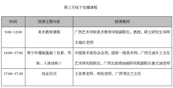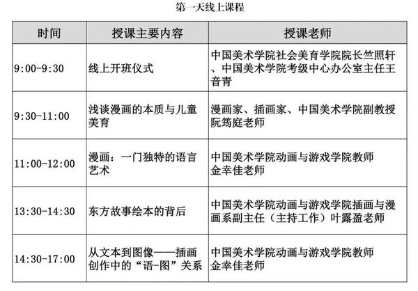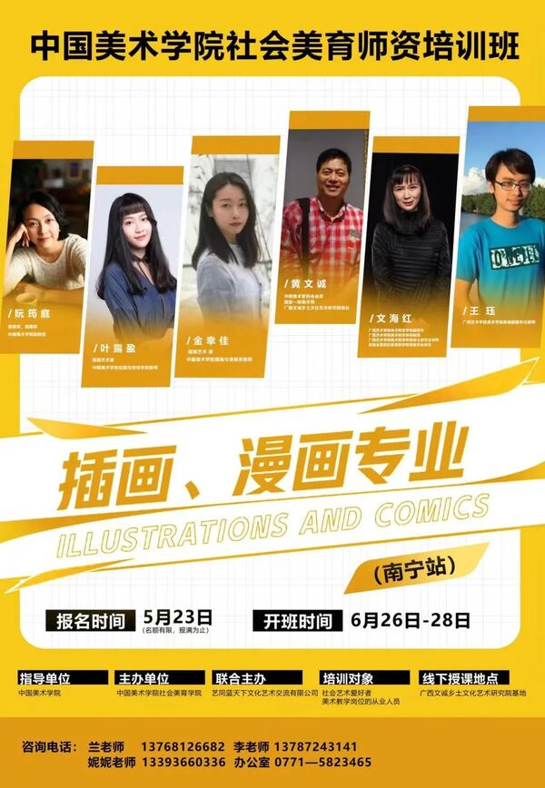 本次中国美术学院社会美育师资培训班(插画、漫画专业),由中国美术学院作为指导单位,中国美术学院社会美育学院主办。同时邀请漫画家、插画家、中国美术学院阮筠庭副教授、中国美术学院动画与游戏学院插画与漫画系副主任(主持工作)叶露盈老师、中国美术学院动画与游戏学院教师金幸佳老师、广西艺术学院美术学院装帧插图专任教师王珏老师、广西艺术学院美术教育学院副院长文海红老师、广西文诚乡土文化艺术研究院院长黄文诚老师作为本期培训导师,将高校教育资源与社会人才培养相对接。
