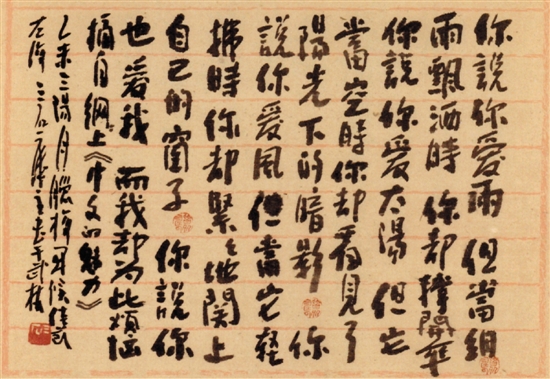 讲到好玩性,曾宓书法的文字内容不能不提。除了传统经典的古诗文,曾宓还大量采纳中外新诗警句格言,兼及如今的网络热词等,如“有钱了,不要任性”,“最是那一低头的温柔,像一朵水莲不胜凉风的娇羞”,“青春是一场远行,回不去了;青春是一场相逢,忘不掉了”,“某一天就是永远不会有的那一天”。好玩的曾宓被问及“曾老师,是不是一定不画画了?”他一本正经地笑笑显得很好玩地腼腆:“我是跟着感觉走的。”他没有把话说死,几年不画画曾宓是完全有可能“跟着感觉走”而恢复画画的。喜欢他书法是一回事,喜欢他国画又是一回事,而喜欢曾宓的真人、真才、真气则是顶真的一回事。他说今年他应邀要在浙江美术馆办一次草书书法展,也是最后一次书法展(学术性而非商业性),接着又讲到他如何喜欢于右任的草书,“了不起的大书家”,“草书难认,欣赏者不多”。