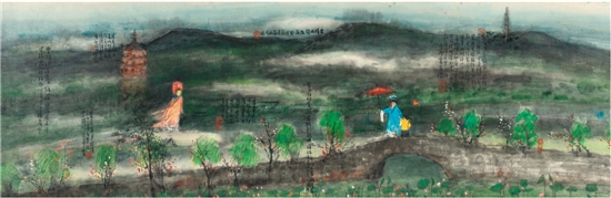《断桥》是曾宓极少数戏曲题材的西湖实景借断桥故事予以展开:烟桥画柳、双塔湖山、荷映人面、风绿拂天。说她是风景画、人物画、山水画、园林画、花鸟画都可以,但又好像都不是,全景、远景、近景都有,却又都是局部可以放大展观并且独立成景的,甚至不妨说她是一张西湖导游图式的平眺、横看、俯视均精彩无比的能唤醒无边联想的西湖妙绘。在保持曾宓一惯的黑密圆柔、浑厚华润、虚和静幽的风格的框架内,曾宓此画的技术表现运用亦堪称一流,尤其色彩亮度属于难得一见的“阳光明媚”,想必他是要把《断桥》故事最美丽开心、闹中取静的一面呈现给世人。