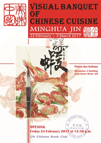 2017年02月24日,这场由联合国日内瓦办事处中文书会主办,以享誉世界的中国美食为创作题材的“活色生香 美味中国”主题画展,在联合国欧洲总部万国宫开幕。金明华在致辞中说:“中国美食背后承载着丰富的文化内涵,画作上呈现的不仅仅是一道道美味,更是中国人对生活的热爱、对传统的继承。民以食为天,中国人如此重视‘吃’,五千年历史孕育出独树一帜的中华饮食文化,我希望将中国人对生活的智慧通过绘画展示给大家。”