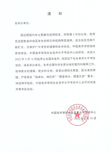 因近期国内本土聚集性疫情频发,特别是3月份以来,疫情在全国数省和地区发生的频次和规模明显增高,波及地区范围不断扩大。为保护广大考生的健康和生命安全,中国美术学院继续教育学院、中国美术学院社会美术水平考级中心经研究,决定从2022年3月16日起停止全国各省市、地区线下社会美术水平考级活动。请各承办单位、各考点要向考生家长做好宣传和解释工作,取得家长的理解、配合和支持,妥善处理相关事宜。配合属地管理,严格落实“谁举办、谁负责”“哪里举办、哪里负责”要求。待疫情平稳后,中国美术学院社会艺术水平考级中心会尽快恢复开展考级活动。