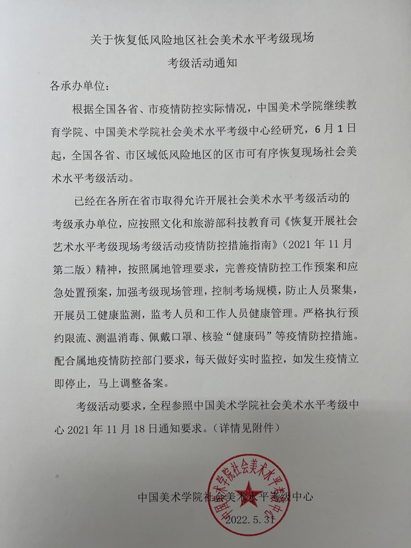 关于恢复低风险地区社会美术水平考级现场考级活动通知
