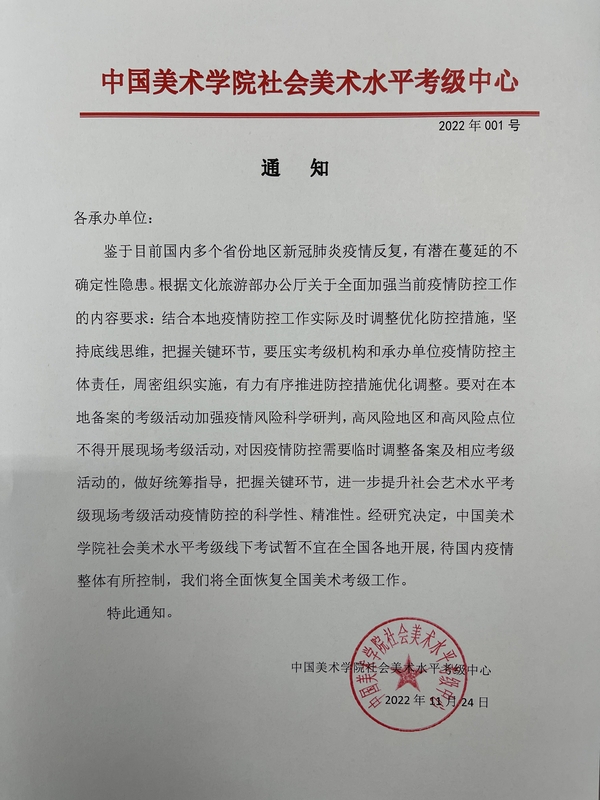 鉴于目前国内多个省份地区新冠肺炎疫情反复,有潜在蔓延的不确定性隐患。根据文化旅游部办公厅关于全面加强当前疫情防控工作的内容要求:结合本地疫情防控工作实际及时调整优化防控措施,坚持底线思维,把握关键环节,要压实考级机构和承办单位疫情防控主体责任,周密组织实施,有力有序推进防控措施优化调整。要对在本地备案的考级活动加强疫情风险科学研判,高风险地区和高风险点位不得开展现场考级活动,对因疫情防控需要临时调整备案及相应考级活动的,做好统筹指导,把握关键环节,进一步提升社会艺术水平考级现场考级活动疫情防控的科学性、精准性。经研究决定,中国美术学院社会美术水平考级线下考试暂不宜在全国各地开展,待国内疫情整体有所控制,我们将全面恢复全国美术考级工作。