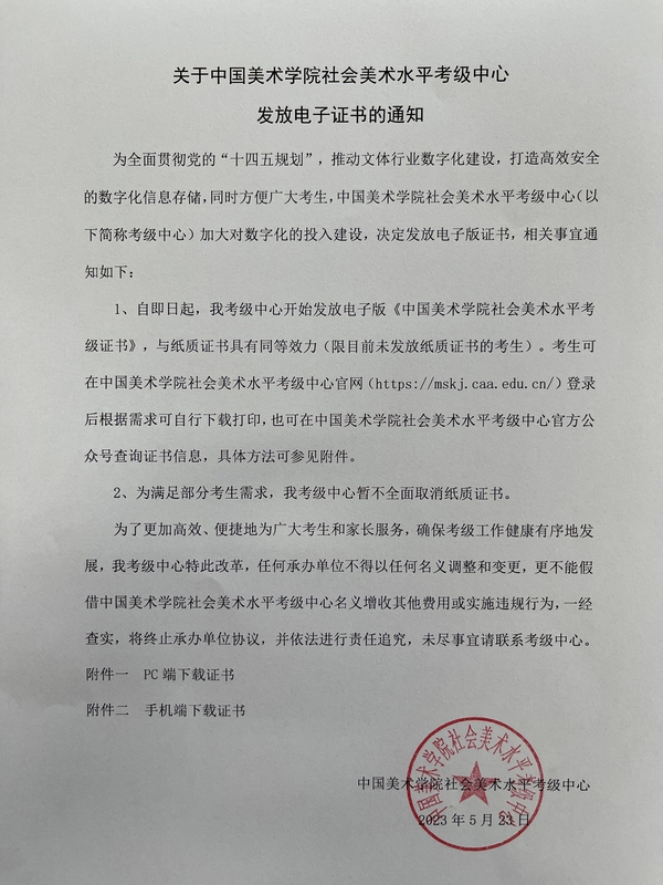 为全面贯彻党的“十四五规划”,推动文体行业数字化建设,打造高效安全的数字化信息存储,同时方便广大考生,中国美术学院社会美术水平考级中心(以下简称考级中心)加大对数字化的投入建设,决定发放电子版证书,相关事宜通知如下: