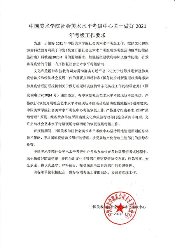 为进一步做好2021年中国美术学院社会美术水平考级工作,按照文化和旅游部科技教育司关于印发《恢复开展社会艺术水平考级现场考级活动疫情防控措施指南》科教函[2020]4号的通知要求,加强新型冠状病毒肺炎疫情防控,有效防范疫情的传播,有序恢复社会艺术水平考级活动。