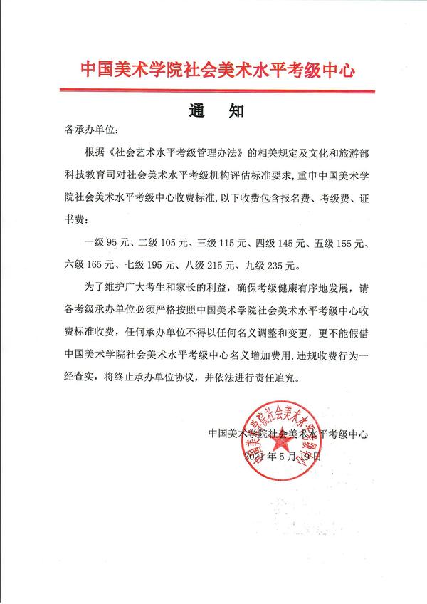 根据《社会艺术水平考级管理办法》的相关规定及文化和旅游部科技教育司对社会美术水平考级机构评估标准要求,重申中国美术学院社会美术水平考级中心收费标准,以下收费包含报名费、考级费、证书费: