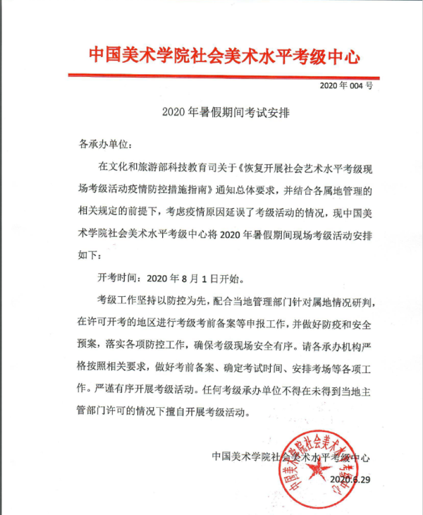 在文化和旅游部科技教育司关于《恢复开展社会艺术水平考级现场考级活动疫情防控措施指南》通知总体要求,并结合各属地管理的相关规定的前提下,考虑疫情原因延误了考级活动的情况,现中国美术学院社会美术水平考级中心将2020年暑假期间现场考级活动安排如下: