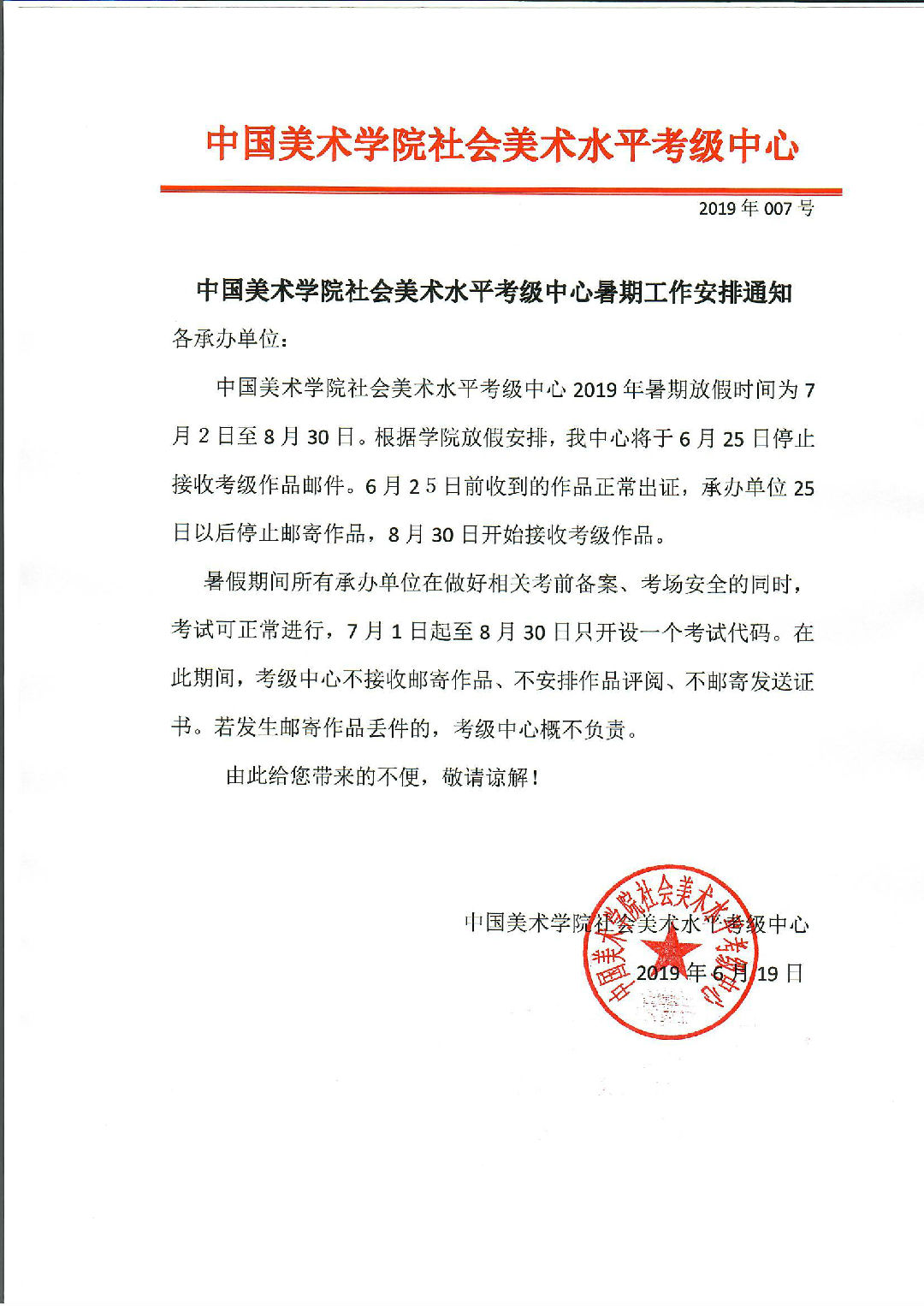 中国美术学院社会美术水平考级中心暑期工作安排通知