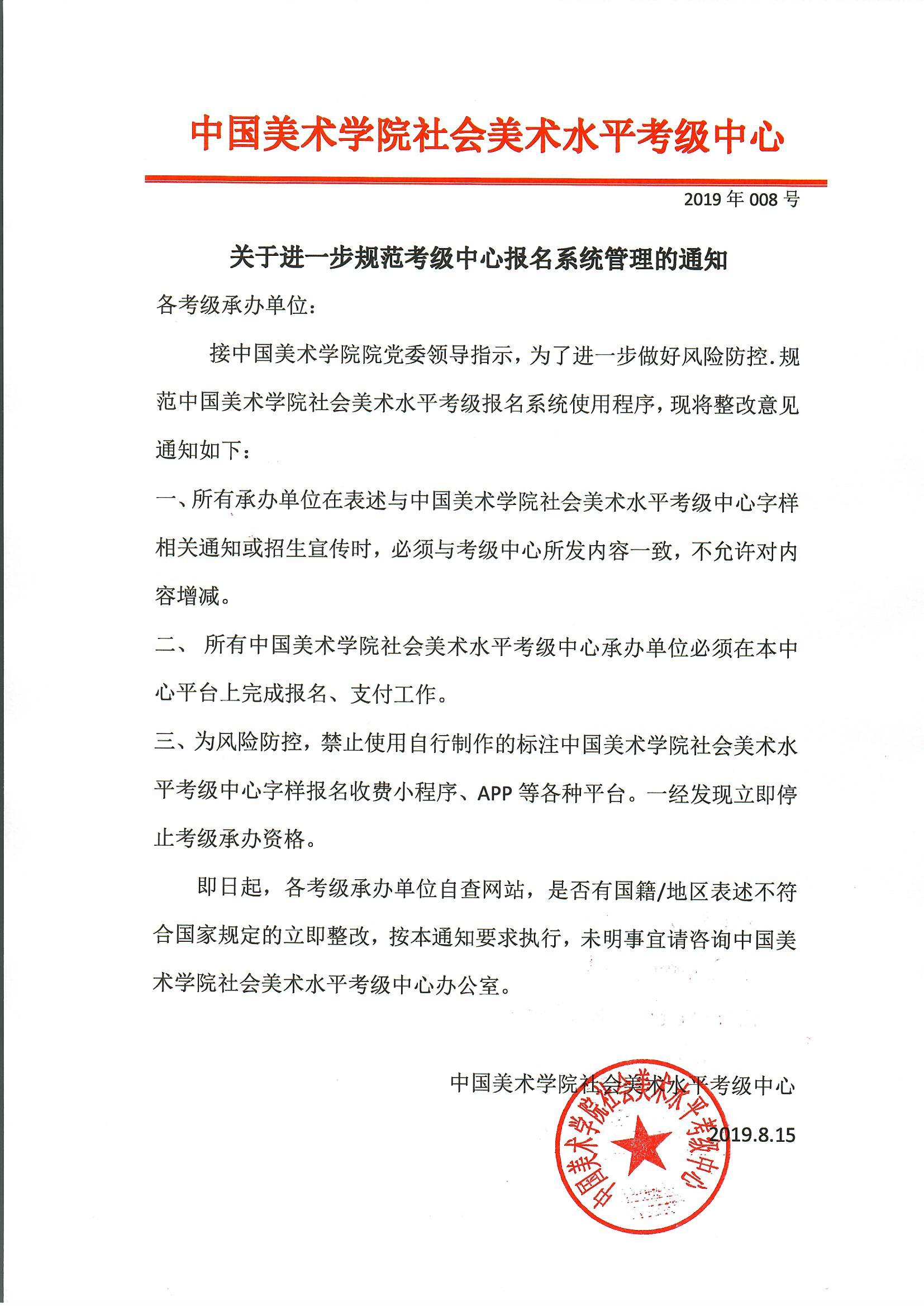 接中国美术学院院党委领导指示, 为了进一步做好风险防控.规范中国美术学院社会美术水平考级报名系统使用程序,现将整改意见通知如下: