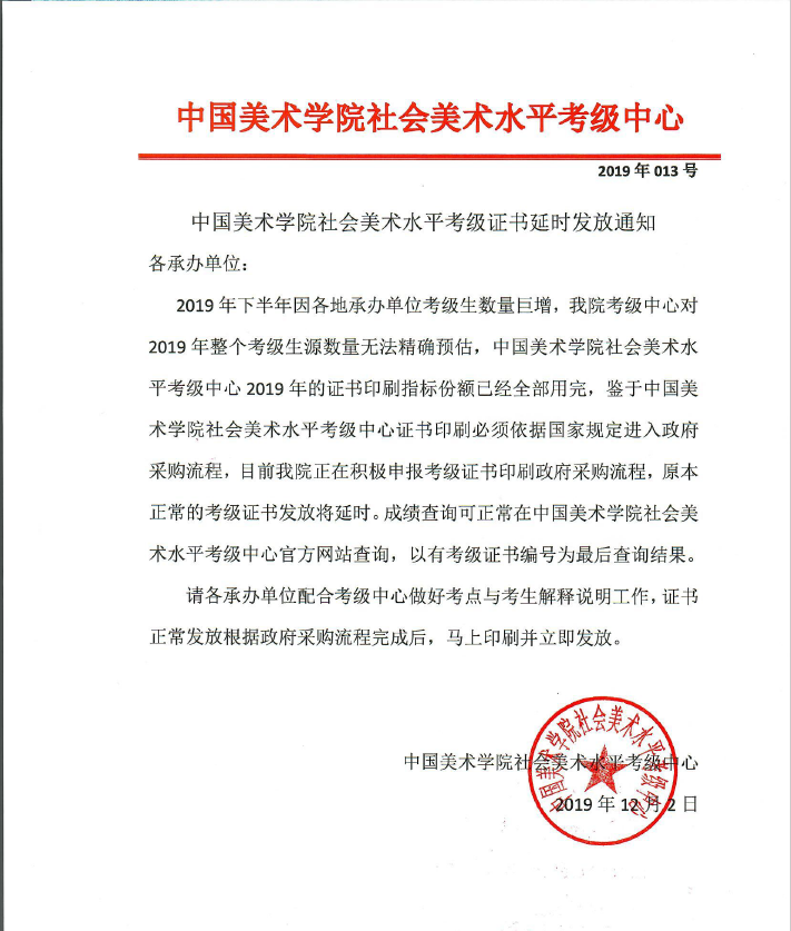 2019年下半年因各地承办单位考级生数量巨增,我院考级中心对2019年整个考级生源数量无法精确预估,中国美术学院社会美术水平考级中心2019年的证书印刷指标份额已经全部用完,鉴于中国美术学院社会美术水平考级中心证书印刷必须依据国家规定进入政府采购流程,目前我院正在积极申报考级证书印刷政府采购流程,原本正常的考级证书发放将延时。成绩查询可正常在中国美术学院社会美术水平考级中心官方网站查询,以有考级证书编号为最后查询结果。