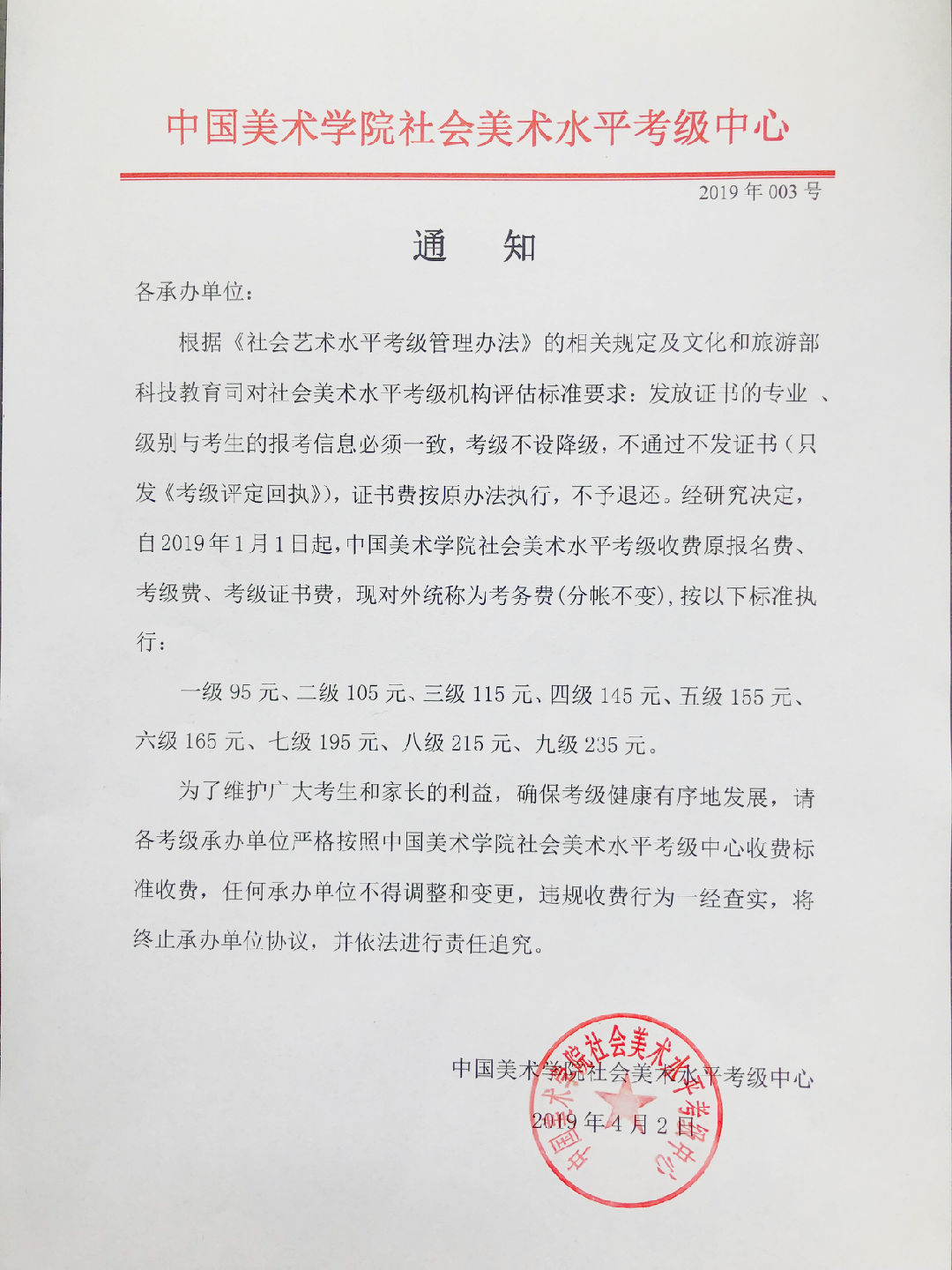 为了维护广大考生和家长的利益,确保考级健康有序地发展,请各考级承办单位严格按照中国美术学院社会美术水平考级中心收费标准收费,任何承办单位不得调整和变更,违规收费行为一经查实,将终止承办单位协议,并依法进行责任追究。